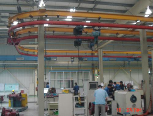 該設(shè)備適用于物料(工件)的線性輸送,根據(jù)用戶對(duì)物料輸送的傳遞、分配要求,可以組合成直線的、環(huán)形的、分岔的等多種形式的單軌輸送線網(wǎng)絡(luò)。通過(guò)采用直線、彎軌、道岔、轉(zhuǎn)盤實(shí)現(xiàn)軌道上輸送物料的任意走向。實(shí)現(xiàn)往返輸送作業(yè)和環(huán)形輸送作業(yè)。輸送線長(zhǎng)度不受限制,可以是簡(jiǎn)單的手動(dòng)控制直線環(huán)形軌道、也可以是多分支的半自動(dòng)或全自動(dòng)控制的環(huán)形軌道,并可以實(shí)現(xiàn)全線供電、也可以實(shí)現(xiàn)分段供電,使每一個(gè)運(yùn)行小車均成為自行驅(qū)動(dòng)行走的輸送單元。